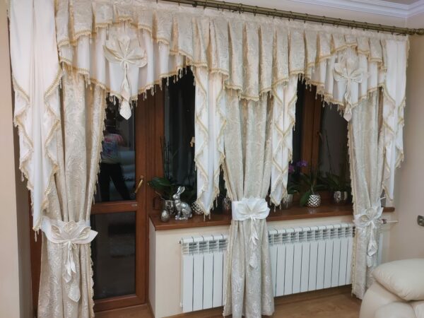 Przedstawiamy elegancki beżowo-złoty lambrekin z dekoracyjnymi kwiatami, który doda luksusu i wyrafinowania Twojemu wnętrzu. Ten wyjątkowy lambrekin wykonany jest z wysokiej jakości tkanin w odcieniach beżu i złota, tworząc harmonijną i stylową kompozycję. Lambrekin ozdobiony jest delikatnymi koralami i kwiatowymi motywami, które nadają mu subtelny i romantyczny charakter. Idealnie nadaje się do salonu, sypialni czy eleganckiego gabinetu, wprowadzając do wnętrza nutę klasyki i wyrafinowania.