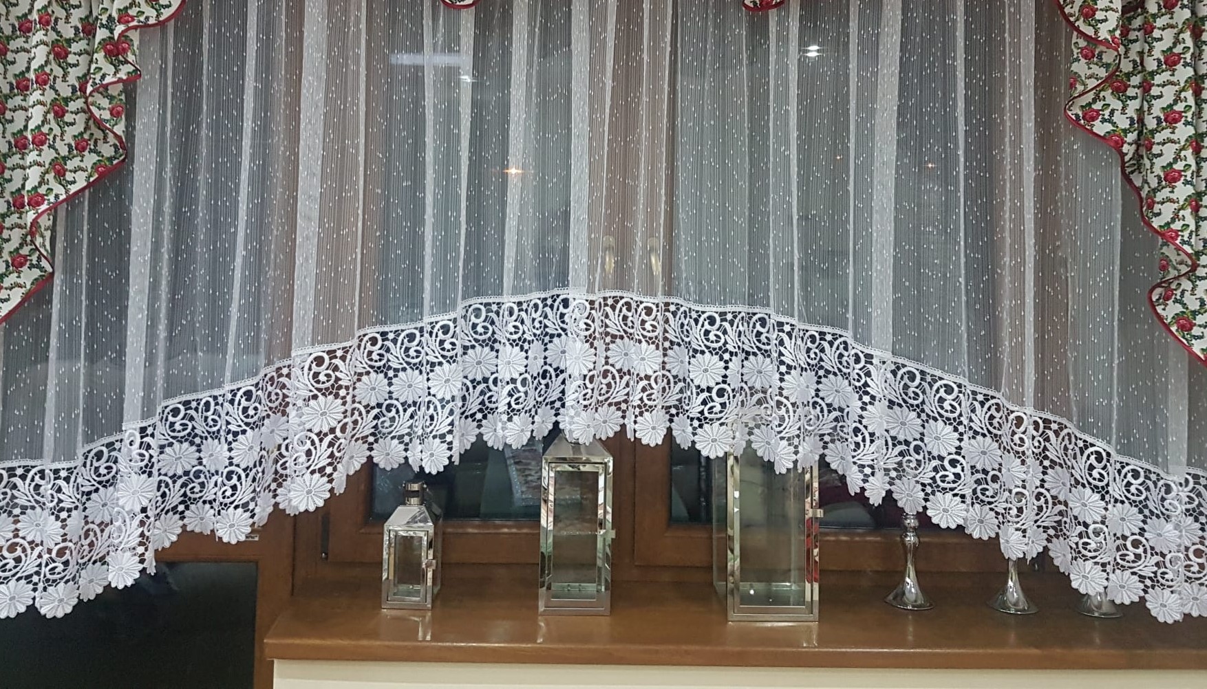 Firana została uszyta na karnisz 2.5m i ma wysokość 1,5 m. Firana dostępna jest w różnych wymiarach na życzenie klienta, aby idealnie dopasować się do Twojego wnętrza. Skontaktuj się z nami, aby zamówić firanę dostosowaną do Twoich potrzeb.